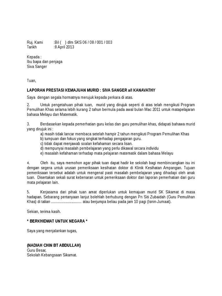 Hari ini cikgu nak kongsikan surat berkaitan yang perlu cikgu-cikgu Pemulihan sediakan untuk rujukan murid ke hospital untuk. BERMASALAH PEMBELAJARAN SMK DEMAK BARUKUCHING. 15 Contoh Ulasan Buku Laporan Murid.