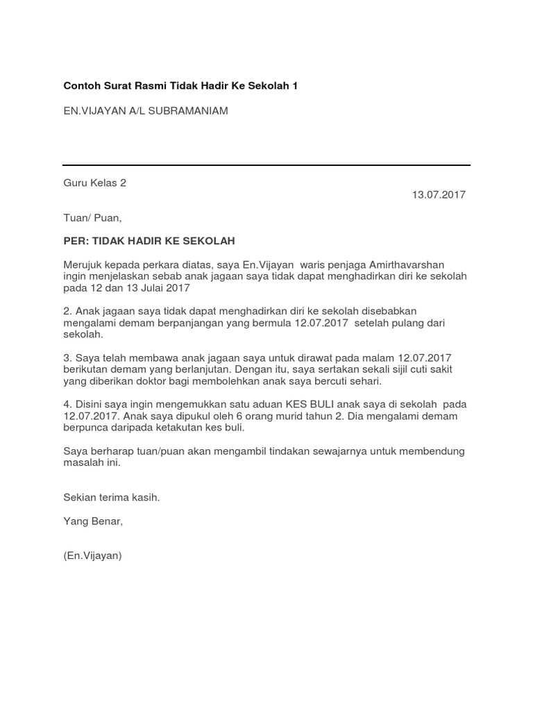 Surat Tidak Hadir Ke Sekolah Urusan Keluarga Petaling Jaya Selangor. Ó Bentuk badan berat badan dan koordinasi motor kanak-kanak ini tidak banyak berbeza dibandingkan dengan kanak-kanak normal. Biasanya Guru BK atau bimbingan konseling yang akan menindak murid tersebut.